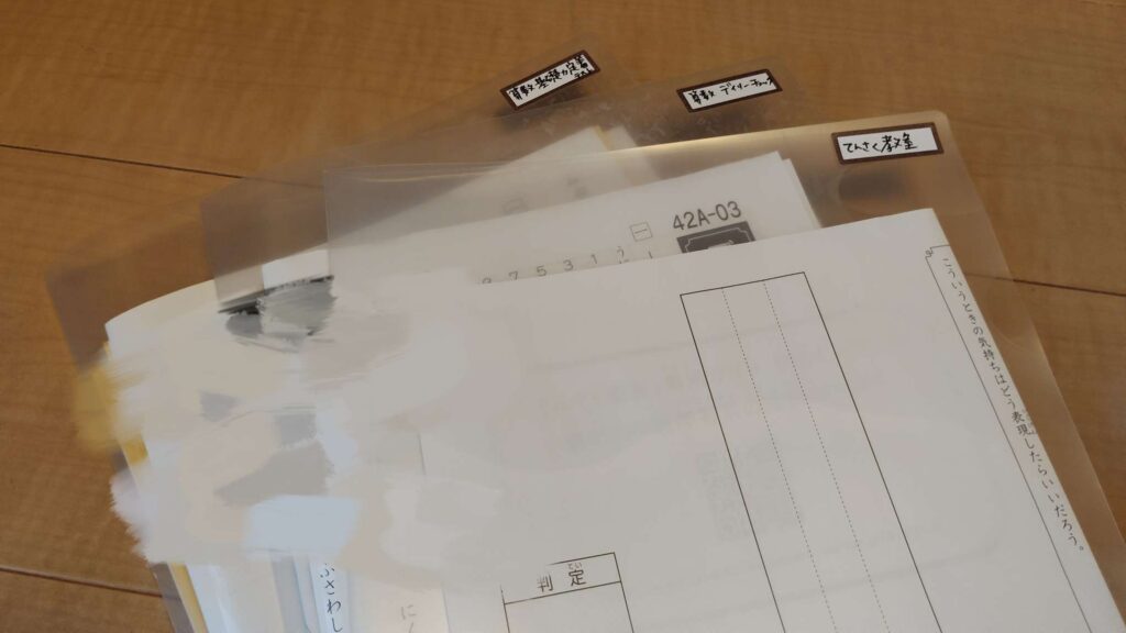 解き終わったプリントは、クリアファイルにまとめて収納しています。
