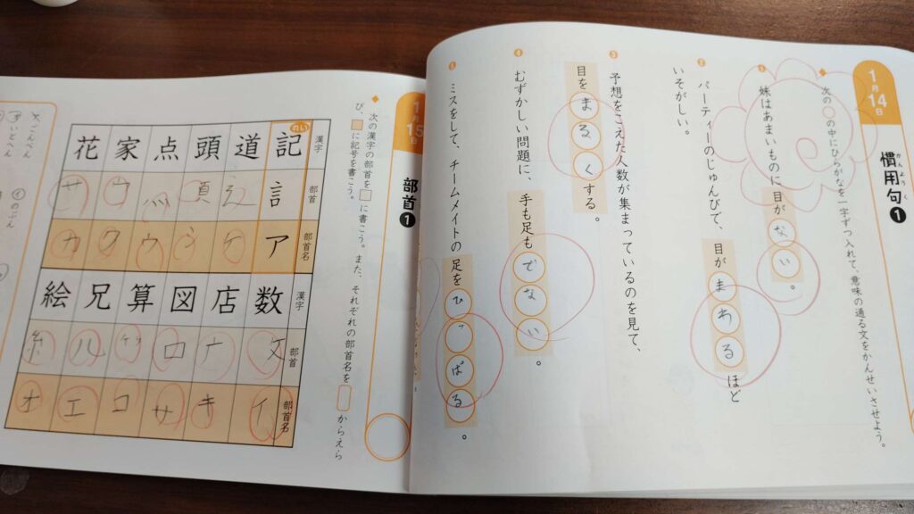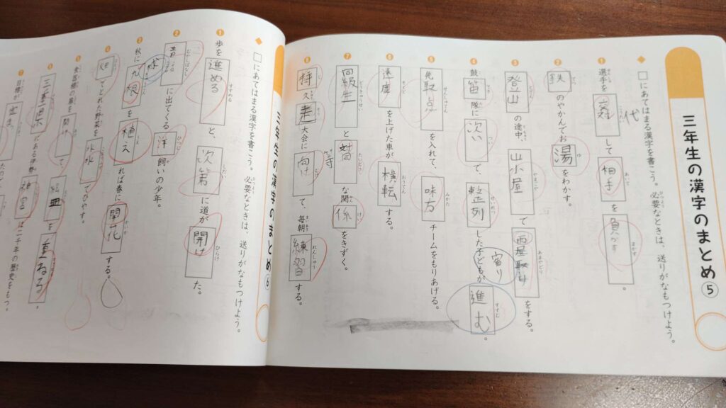 長男には、まず一人で国語・漢字・算数を一通りやってもらい、わからないところはそのまま空けておくようにしていました。あとから一緒に確認する、というスタンスです。