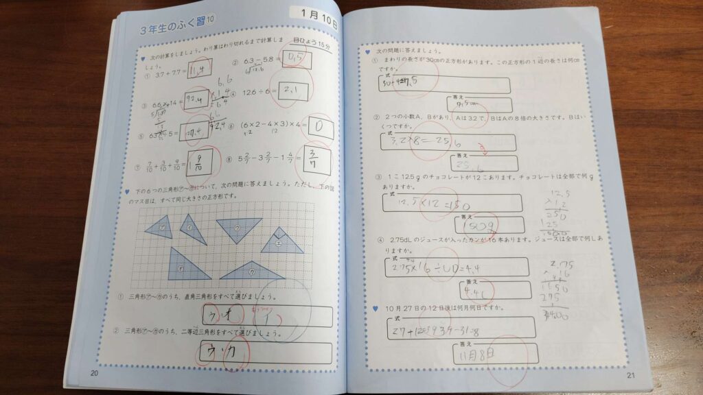 わが家も最初は“多い”と感じていましたが、日によっては長男の得意な単元や簡単な問題の日もあり「今日はあっというまに終わった♪」という日もあるので、モチベーションを上げつつ、継続しやすかったです。